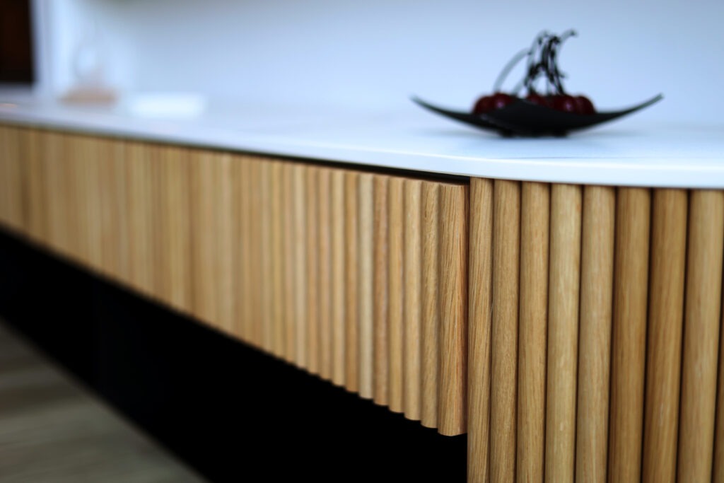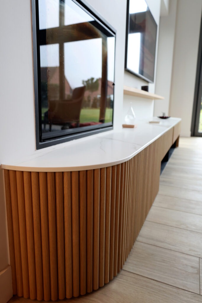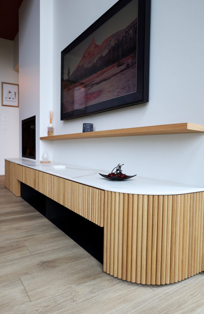 De nombreux particuliers choisissent un meuble TV sur mesure en chêne, complété par un dessus en marbre et une façade en tasseaux verticaux, pour associer chaleur du bois et élégance des matériaux nobles.